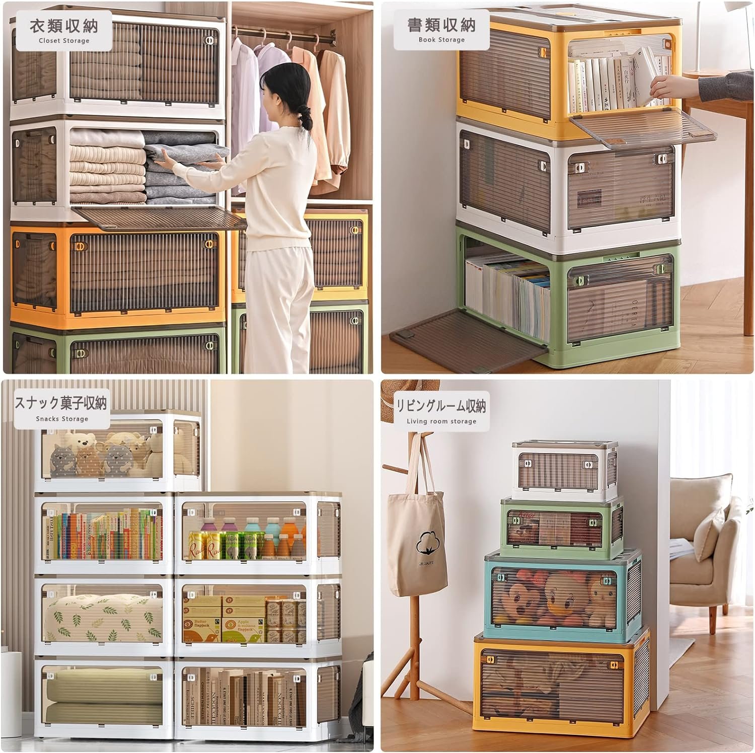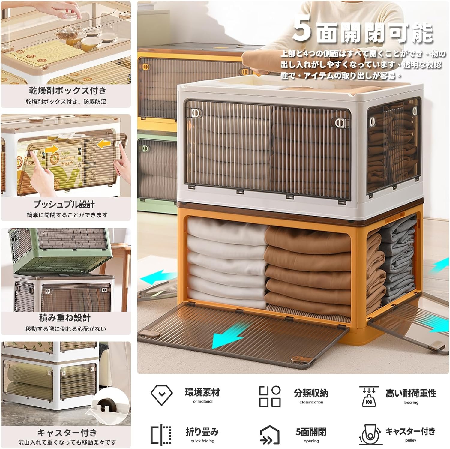 • 【折り畳み▪上に蓋/側面扉付き】収納箱界の大革新!使わない時に折りたたんで収納できます。スペースを取りません。側面四面も扉付き、収納にとても便利です。上にふた付き、物を入れやすい。蓋をロックできます。物を取るは側面扉から、ボックスを積み重ねる状態にも楽に物を取り出して、伝統的な収納ボックスに比べてもっと便利で、機能性が向上します。
