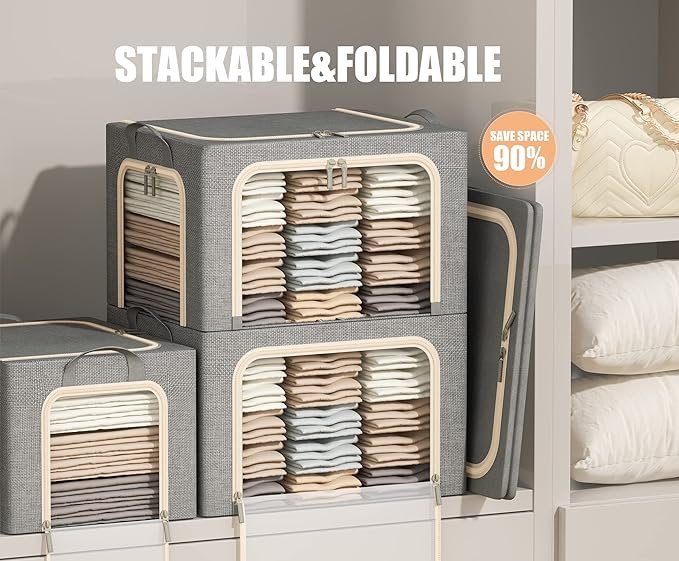 【スタッカブル&フォルダブル】内部には頑丈なスチールフレームが組み込まれており、変形することなく他の収納ボックスの上や下に積み重ねることができます。たとえば、デスクの下やクローゼット内で使用可能です。折りたたみ式のデザインで、使用しない時はフラットに折りたためるため、スペースを節約できます。
