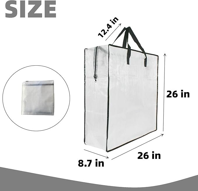 • 透明ストレージバッグ:引越し用パッキングバッグの透明デザインにより、ストレージの内容物を簡単に確認でき、バッグを探したり開けたりする必要なく迅速に識別できます。同時に、透明なジッパー付きストレージバッグは、アイテムを水、ほこり、汚れから保護し、長持ちする耐久性を確保します。クリアな移動バッグは、引越し、旅行、キャンプ、大学の寮移行、収納に最適な省スペースの解決策です。