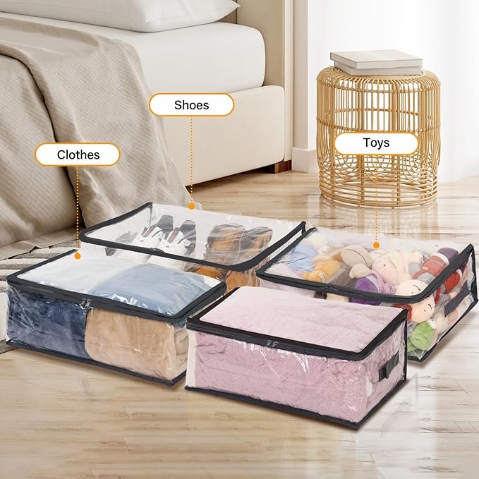 このセットには、サイズ19.5 x 14 x 8インチのグレーのクリア収納バッグが2つ含まれており、各バッグの容量は35L(約9.5ガロン)です。季節ごとの衣類を狭いクローゼットや引き出し、クローゼットの上の棚、またはベッド下に便利に収納できます。