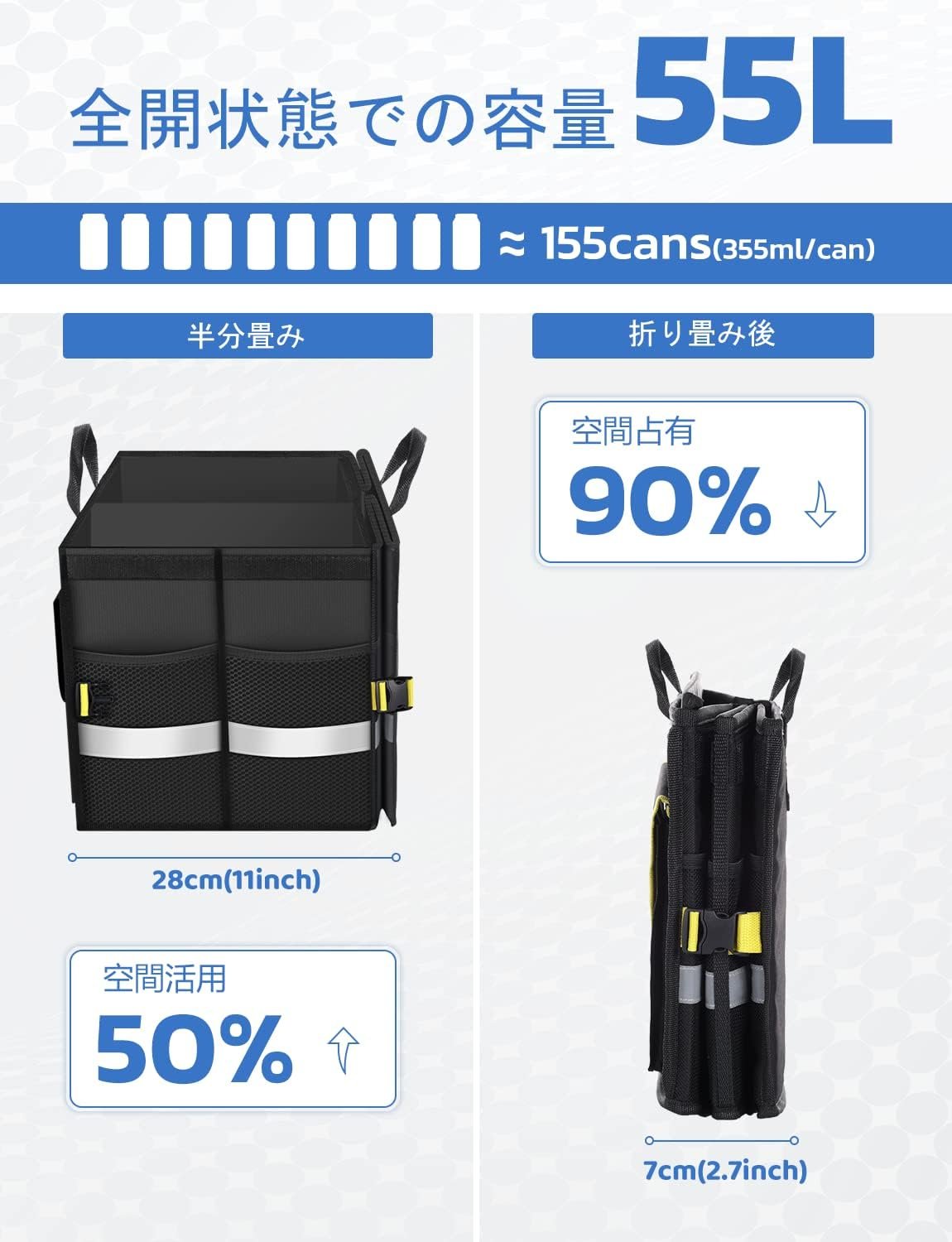 • 仕切り付きや折り畳み式:仕切り2枚が付属、需要に応じ収納スペースをカスタマイズできる、半分畳んで半分だけを使うのも可能。寸法:55*35*27cm;折り畳み後:7*35*27cm