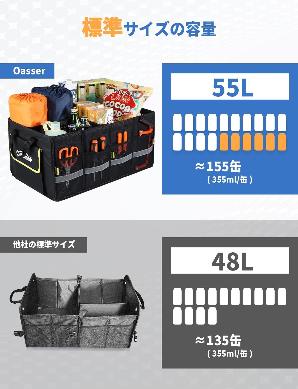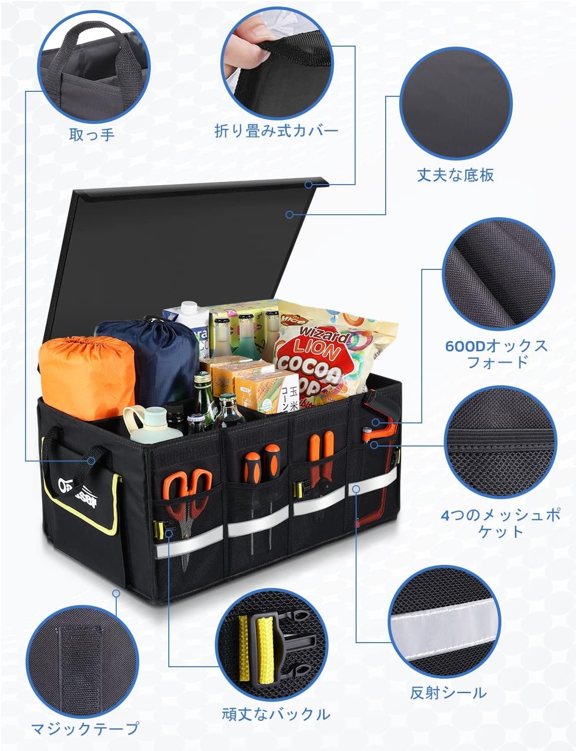 • 多用途:車用収納ボックスは55Lの収納容量を持ち、タオル、工具、その他の様々な車用品を簡単に収納し、トランクを整理整頓した状態にする。トランクの整理整頓だけでなく、家庭用やキャンプ時の収納なども利用可能。