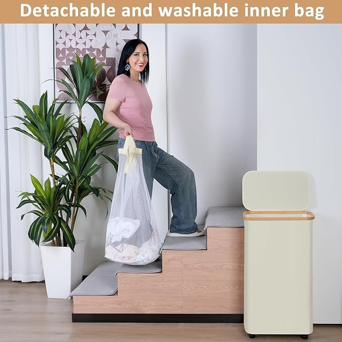 【便利な移動性と内袋デザイン】 iEGrowの75L容量のランドリーバスケットは、4つのホイールが付いており、そのうちの2つにはブレーキが付いています。これにより、家の中での移動が簡単で、安定性が確保されます。取り外し可能な内袋が付いており、衣類の仕分けが容易で、清掃も簡単です。