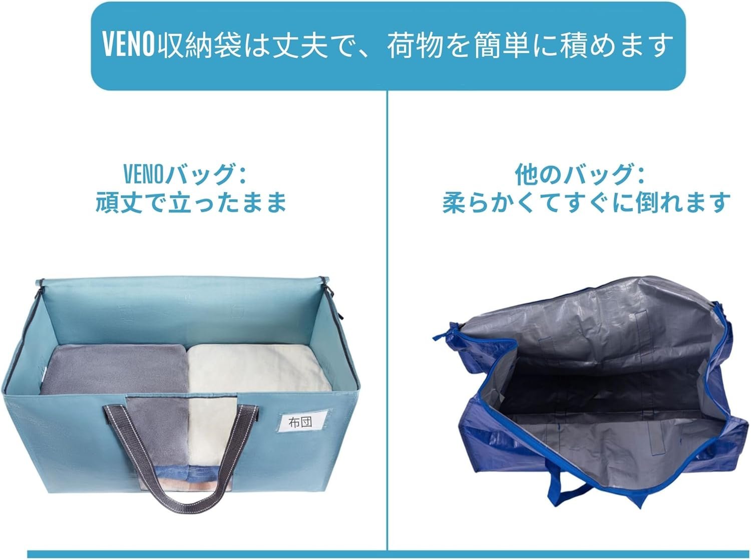 • 【立てても収納可能】収納袋が倒れる心配がなく、大きく開く2ウェイジッパートップにより、荷物の積み下ろしをスムーズに行えます。VENOの大容量収納袋は耐久性のあるPP織素材を使用しており、直立した状態で簡単に積み込みが可能です。また、一生使用できるため、移動、収納、整理が簡単です。VENO引っ越しバッグ、布団収納袋、収納ボックスで安定性と安全性を確保しましょう。