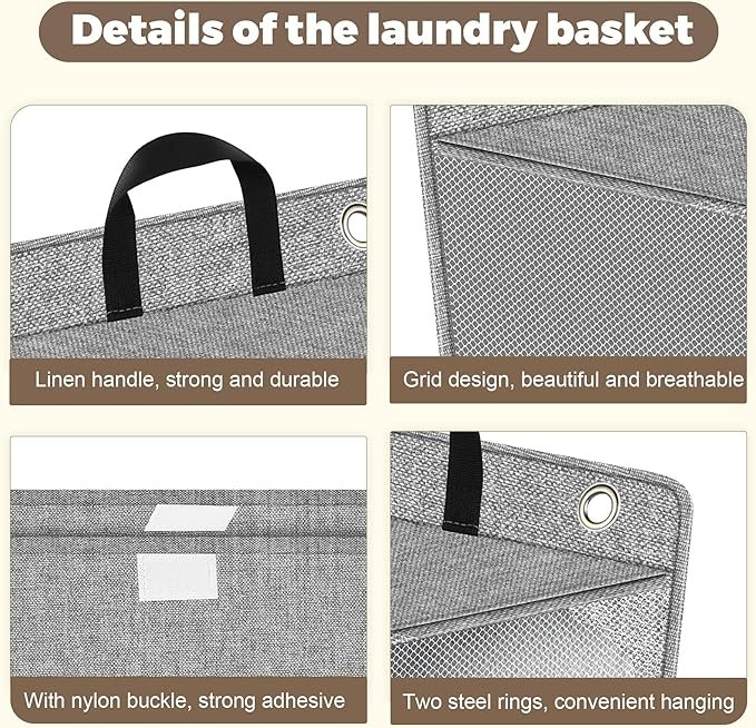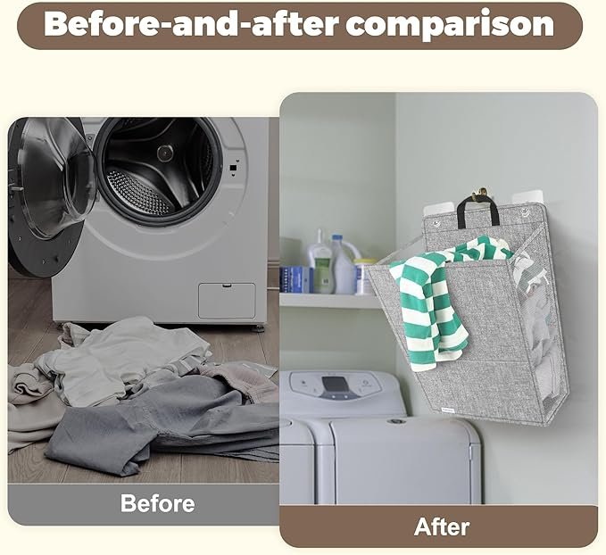 吊り下げ式ランドリーバスケット: Supowinのランドリーバスケットは、洗濯機の側面やバスルームのドアに掛けることができ、床のスペースを取らずに収納できます。バスケット内にアイテムが半分以上入っていると立てておくことができますが、それ以下の場合は立てておくことができません。