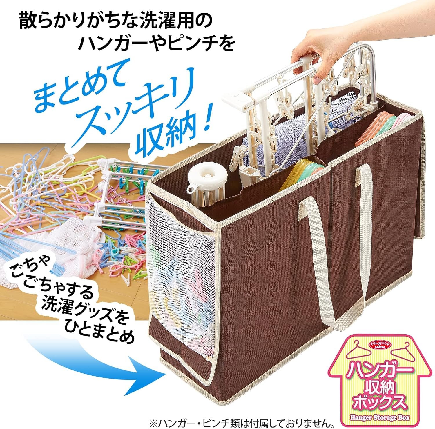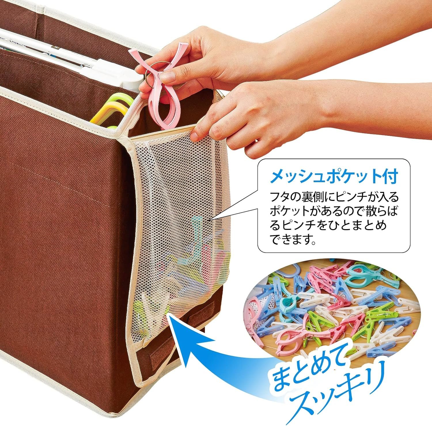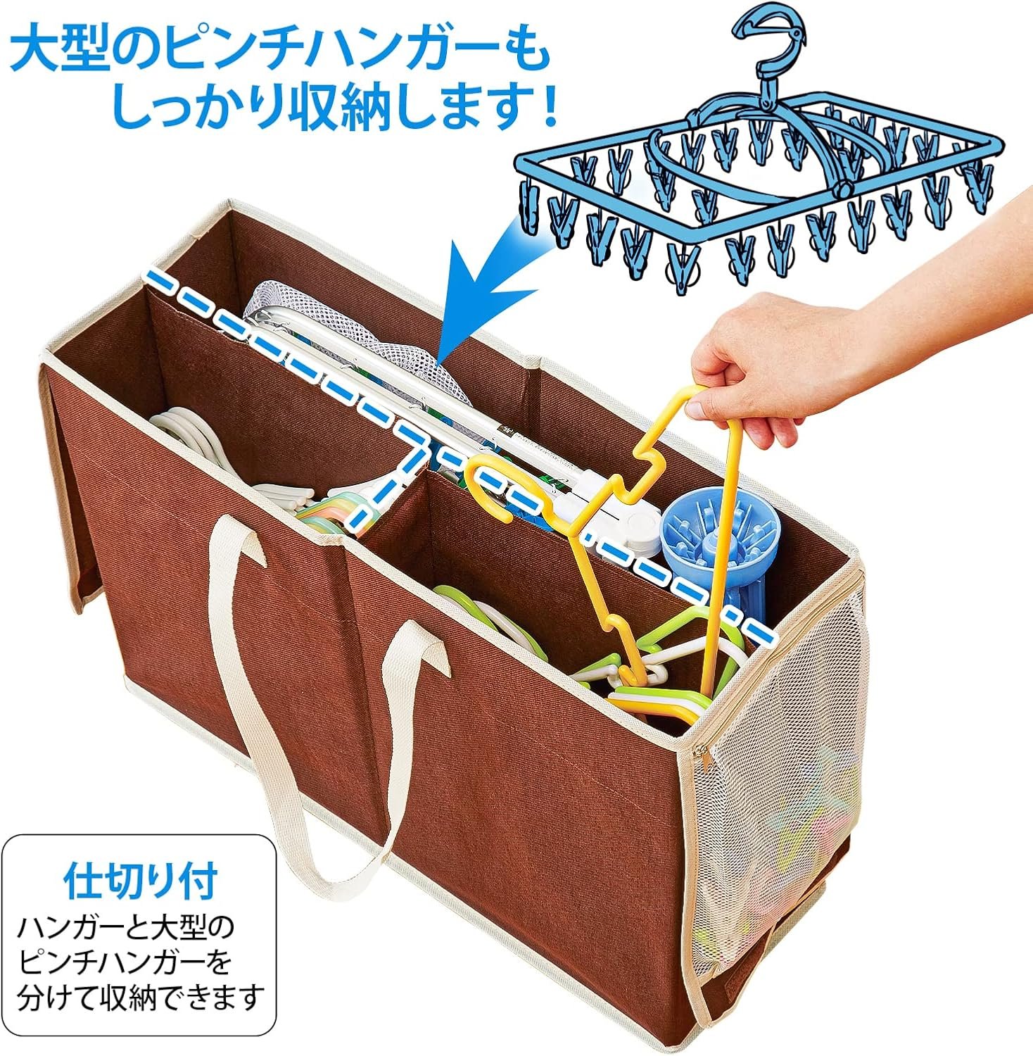 • 【洗濯用品をまとめてスッキリ収納】こまごまとして散らかりがちな洗濯用のハンガーから大型のピンチハンガーまでひとつにまとめてスッキリ収納!仕切りが付いているので、ハンガーとピンチハンガーを分けて収納できます。フタの裏側には洗濯バサミが入るメッシュポケット付き。