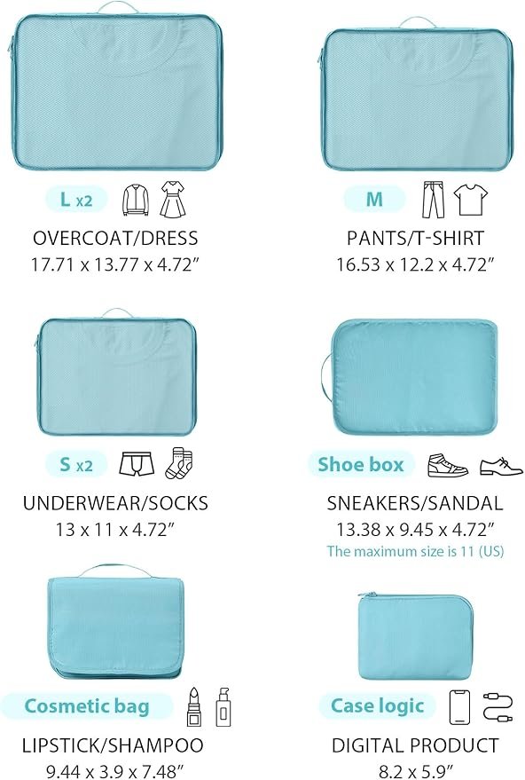 ▶ 8パックセット:5つのパッキングキューブ – 大2個(17.7 x 13.7 x 4.7インチ)、中1個(16.5 x 12.2 x 4.7インチ)、小2個(13 x 11 x 4.72インチ)。さらに、1つの靴袋、1つのトイレタリーバッグ、1つのケーブルケースが付属しています。キャリーオンスーツケース用の8個のパッキングキューブが、次の旅行の準備を効率的に手助けします。