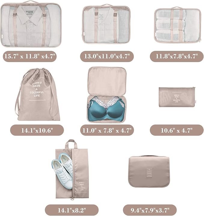 【8アイテムの内容】 パッキングキューブ: 大型パッキングキューブ:15.7″ x 11.8″ x 4.7″; 中型パッキングキューブ:13.0″x11.0″x4.7″; 小型パッキングキューブ:11.8″x7.8″x4.7″; ブラ・下着バッグ:11.0″ x 7.8″ x 4.7″; 防水メイクバッグ:9.4″x7.9″x3.7″; フラットバッグ:10.6″ x 4.7″; シューズバッグ:14.1″x8.2″、ランドリーバッグ:14.1″x10.6″。大容量の旅行必需品バッグセットです。
