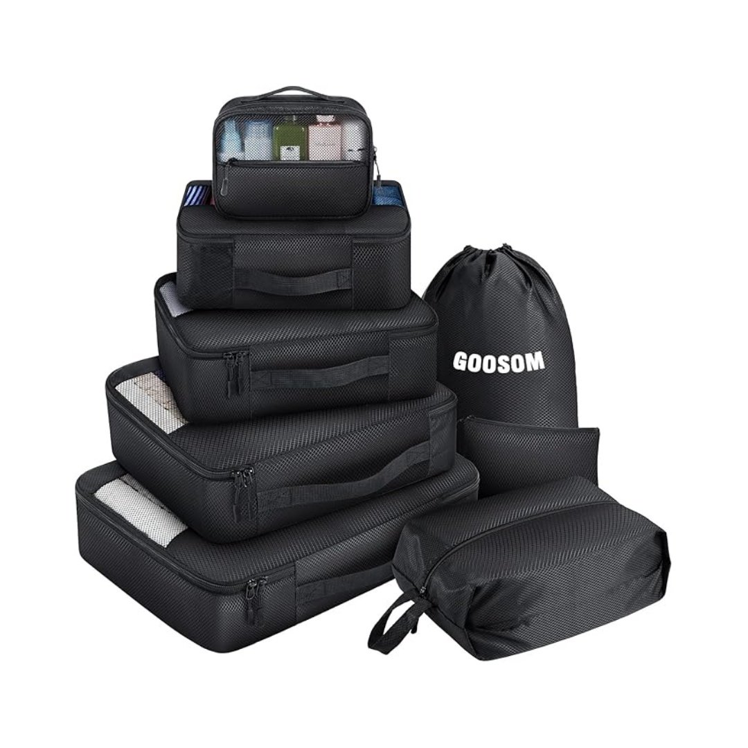 • 旅行用パッキングキューブセット:8ピースの旅行用パッキングキューブには、異なるサイズのメッシュ製パッキングキューブ(大、中、小)、下着用バッグ、化粧品バッグ、靴バッグ、アクセサリーバッグ、洗濯袋が含まれており、ジャケット、シャツ、パンツ、下着、トイレタリーなどの旅行必需品を収納できます。