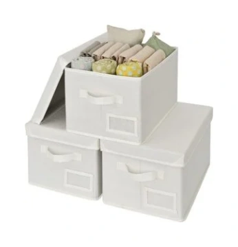 ニュートラルカラーの生地で覆われ、耐久性のあるボードで補強されたクローゼットビンは、堅牢で積み重ね可能です。