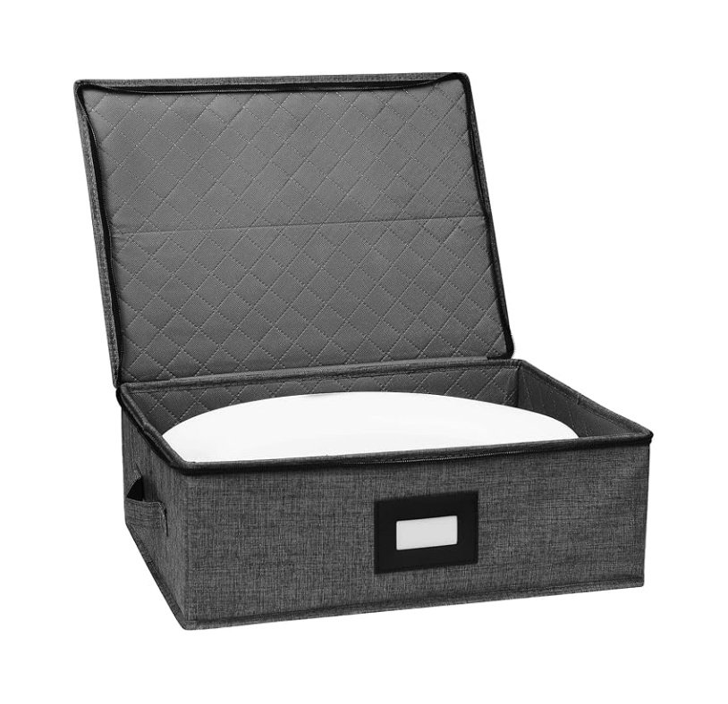 中国製収納コンテナのサイズは 17″ x 13″ x 6″ です。各コンテナは6枚の皿を収納でき、各コンテナには16×12インチのフェルト製プレートセパレーターが5枚含まれており、チッピングや傷から保護します。