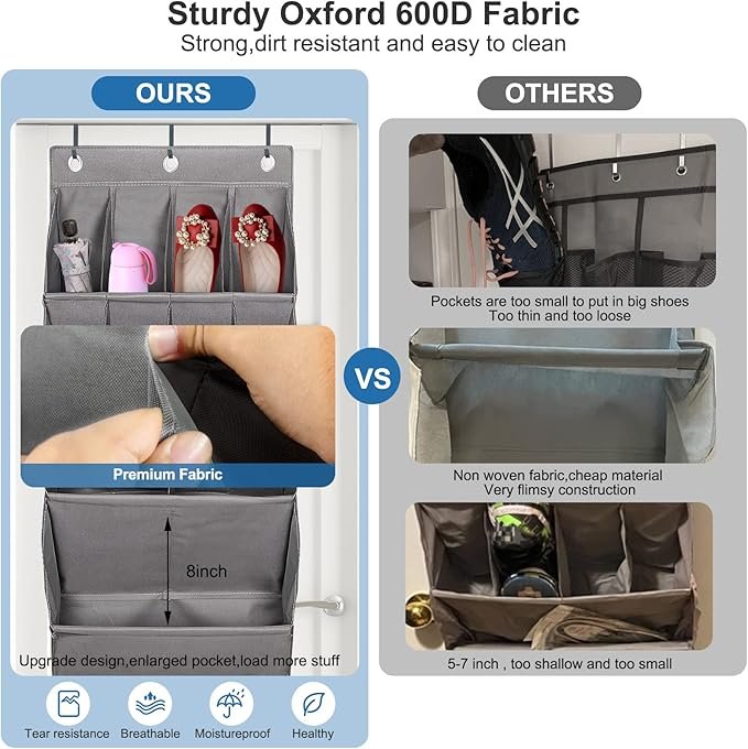 丈夫で耐久性のある生地:耐久性と耐引裂性に優れた600Dオックスフォード生地を使用しており、40ポンドまでの重量に耐えられます。各段には強力なファイバーチューブが入っており、変形を防ぎ、ポケットの安定性を向上させます。男性用の大きな靴やブーツを収納するのも全く問題ありません。