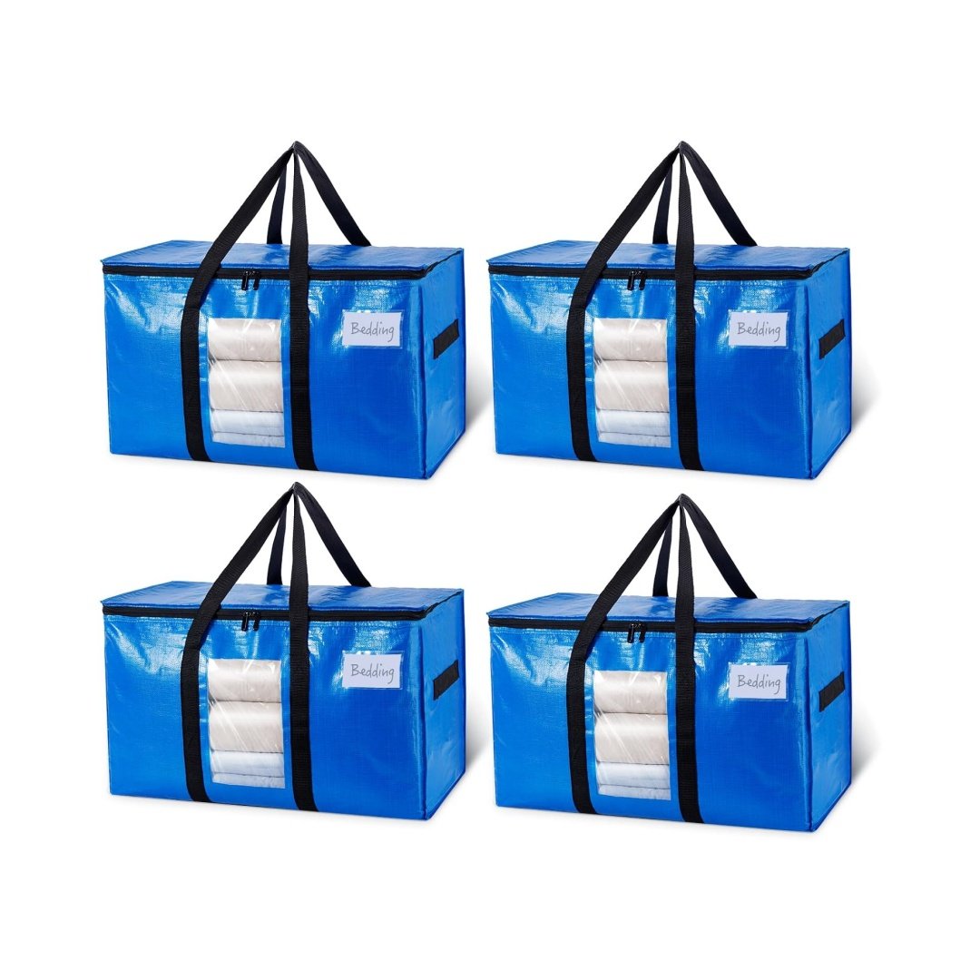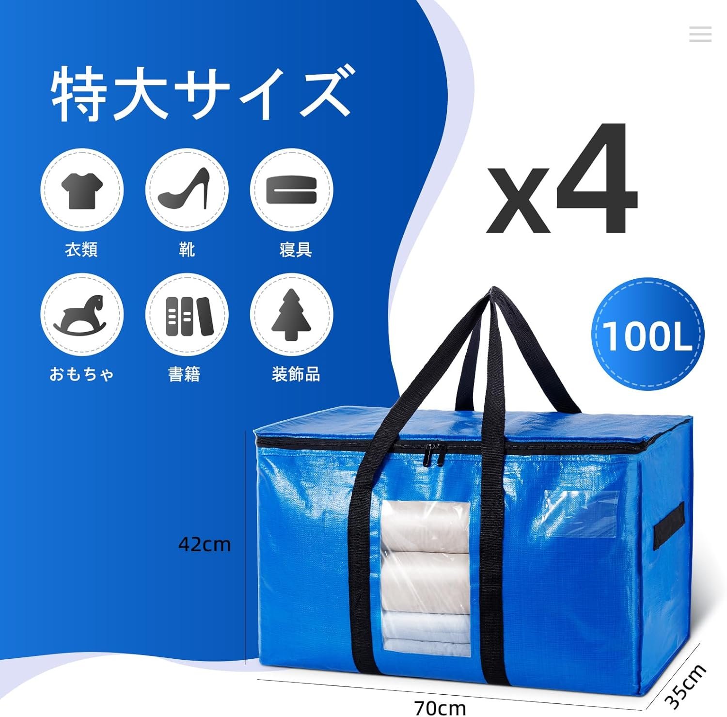• 100L大容量、収納力抜群:抜群な特大引越しバッグの寸法:70 cm 35 cm 42 cm、4 パック。 両端のジッパーと中央に大きな開口部があるため、衣類、おもちゃ、靴、タオル、必需品、枕、寝具、シーツ、毛布、洗濯物、クリスマス飾りなどを簡単に収納できます