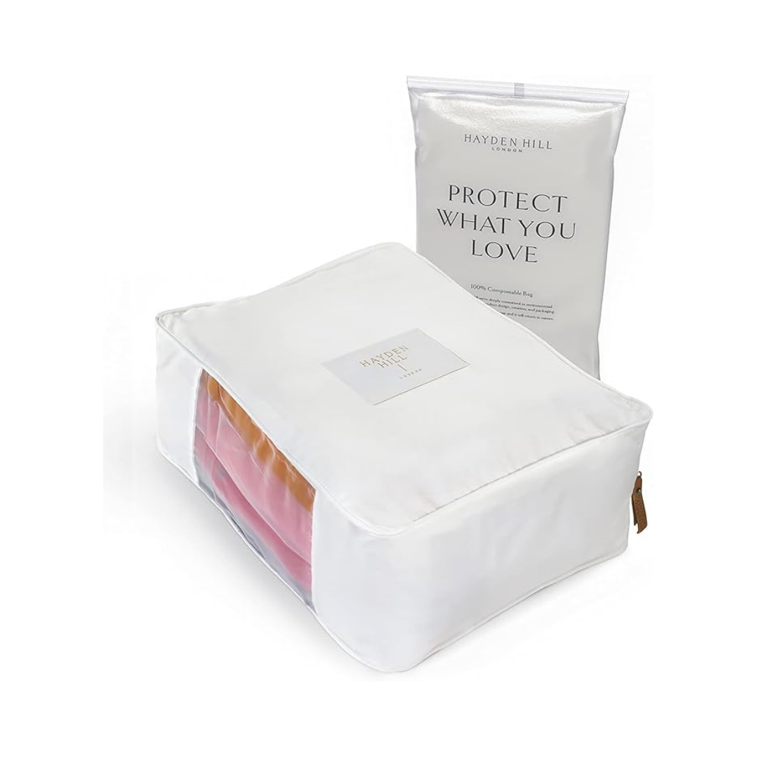 透けるオーガンザパネルで内部が簡単に確認でき、詳細なパイピングによってガーメントバッグの形状を維持します。ヘイデン・ヒルの通気性ストレージバッグは、湿気の蓄積を防いで衣類を保護するように設計されています。