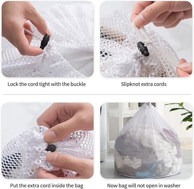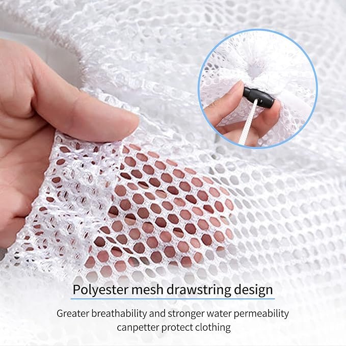 【素材とデザイン】ポリエステルメッシュのドローストリングデザインで、衣類を保護し、水流を増やしてより効果的な洗浄と収納容量を実現します。